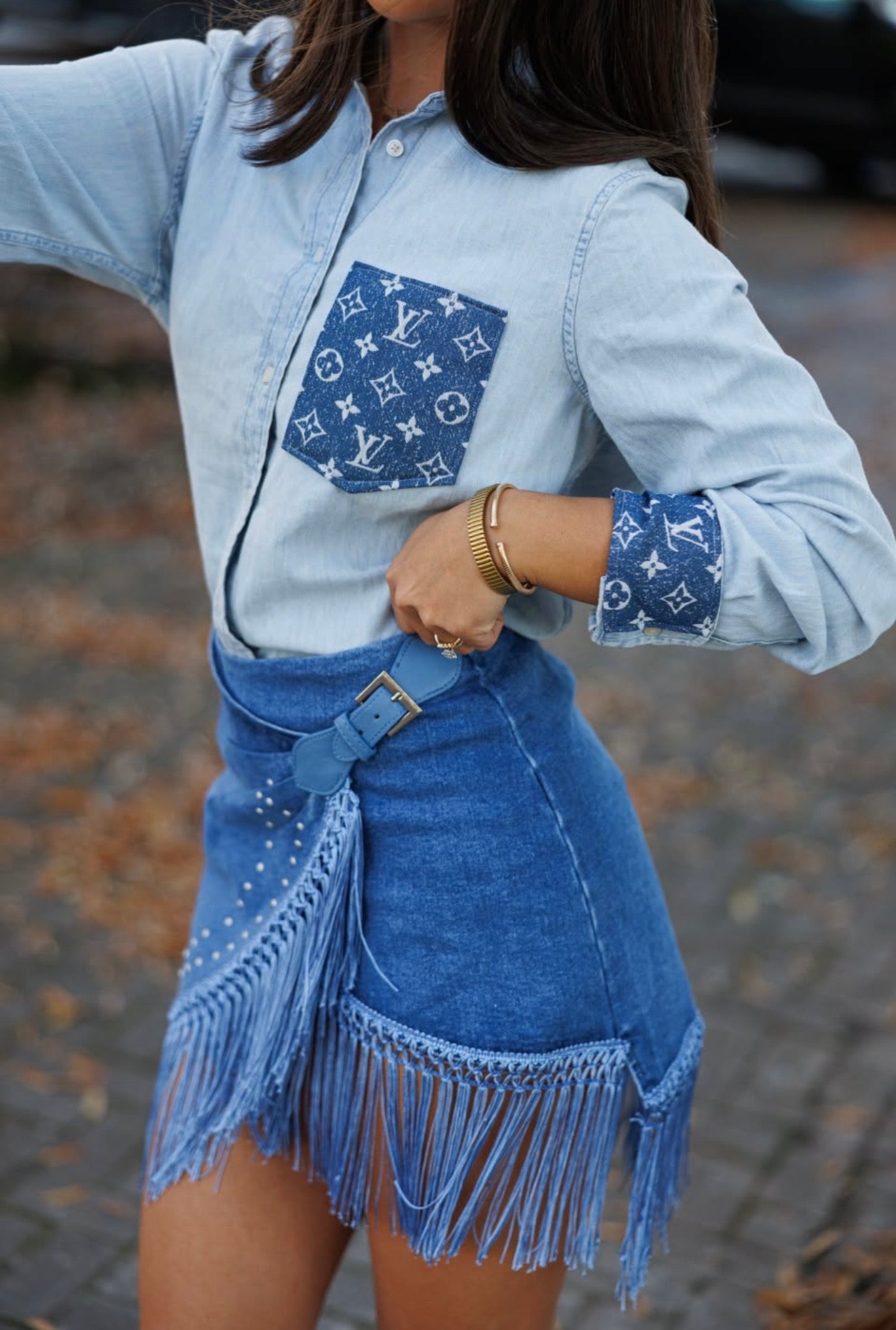 Relaxed fit button down shirt. Upcycled dust bag on pocket. Pocket is sewn shut.