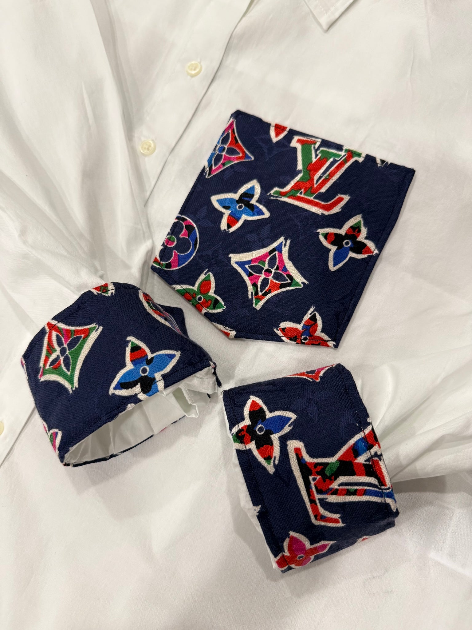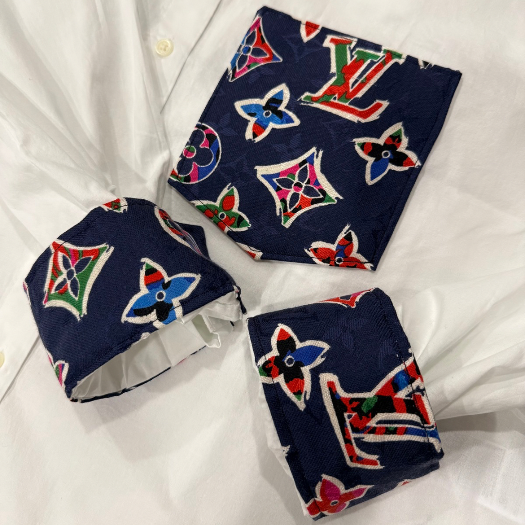Oversized boyfriend cut button down shirt. Upcycled scarf on cuffs and pocket. Pocket is sewn shut.