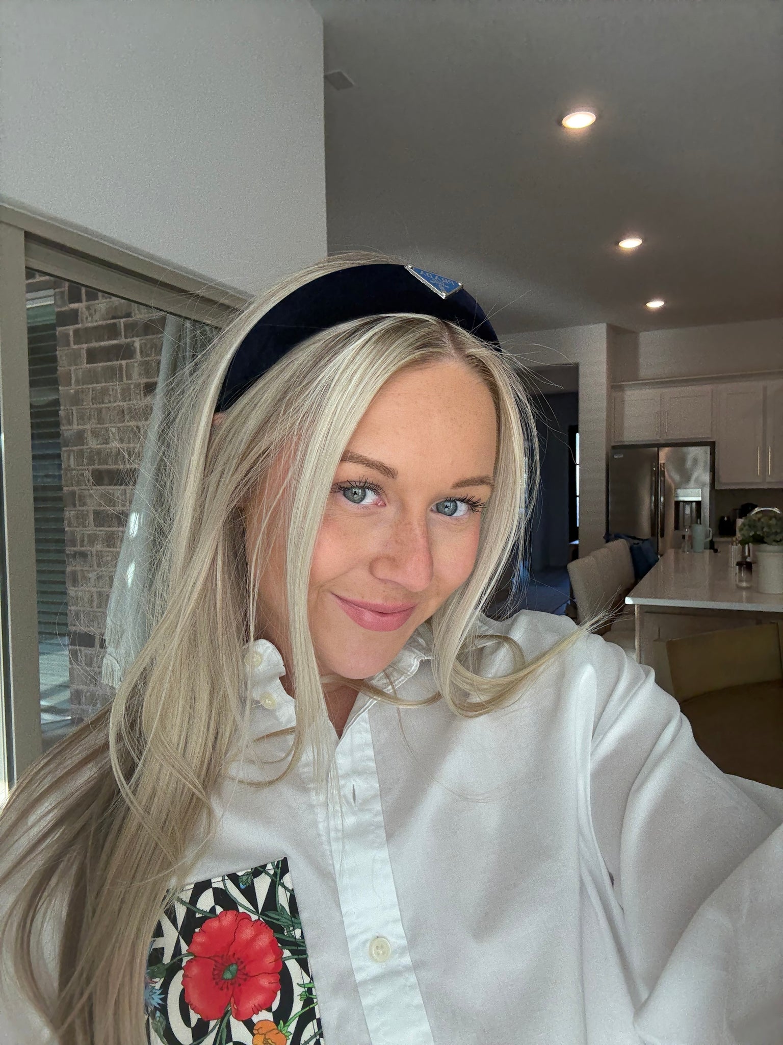 Navy blue velvet headband with repurposed bag charm. Made on our comfort fit 1” headband.