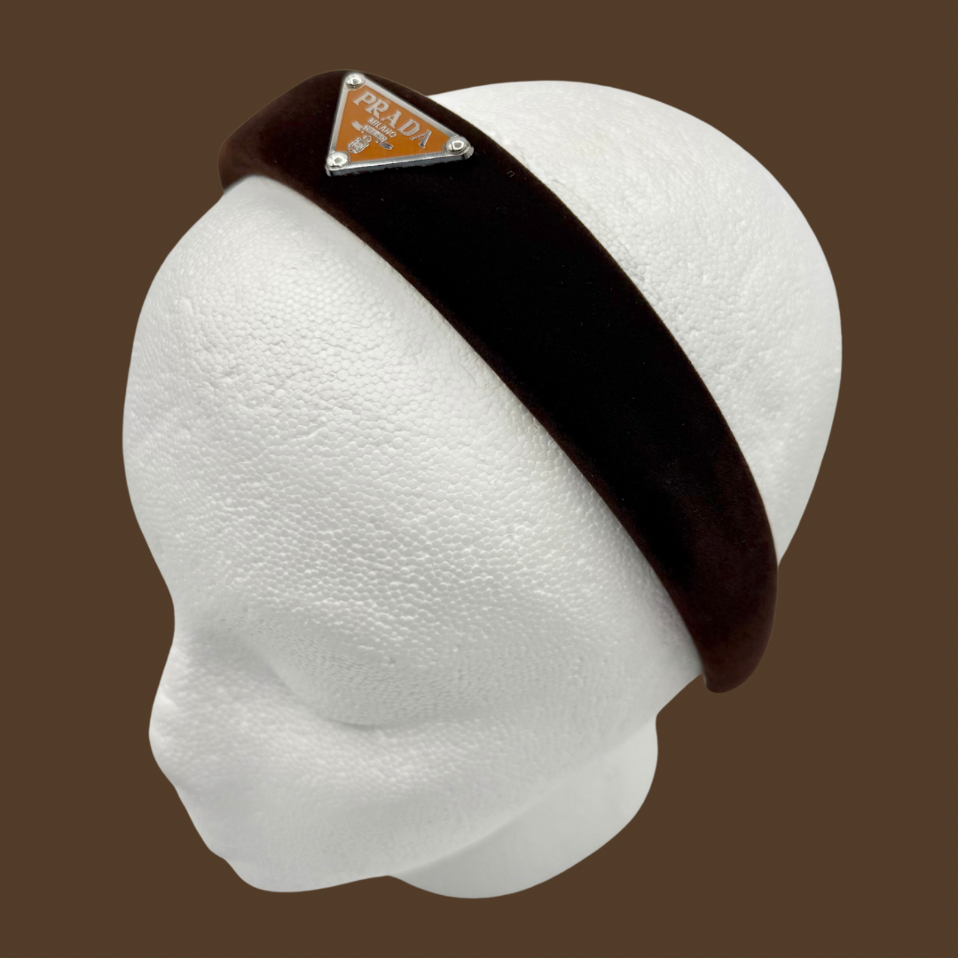 Brown velvet headband with repurposed bag charm. Made on our comfort fit 1” headband.