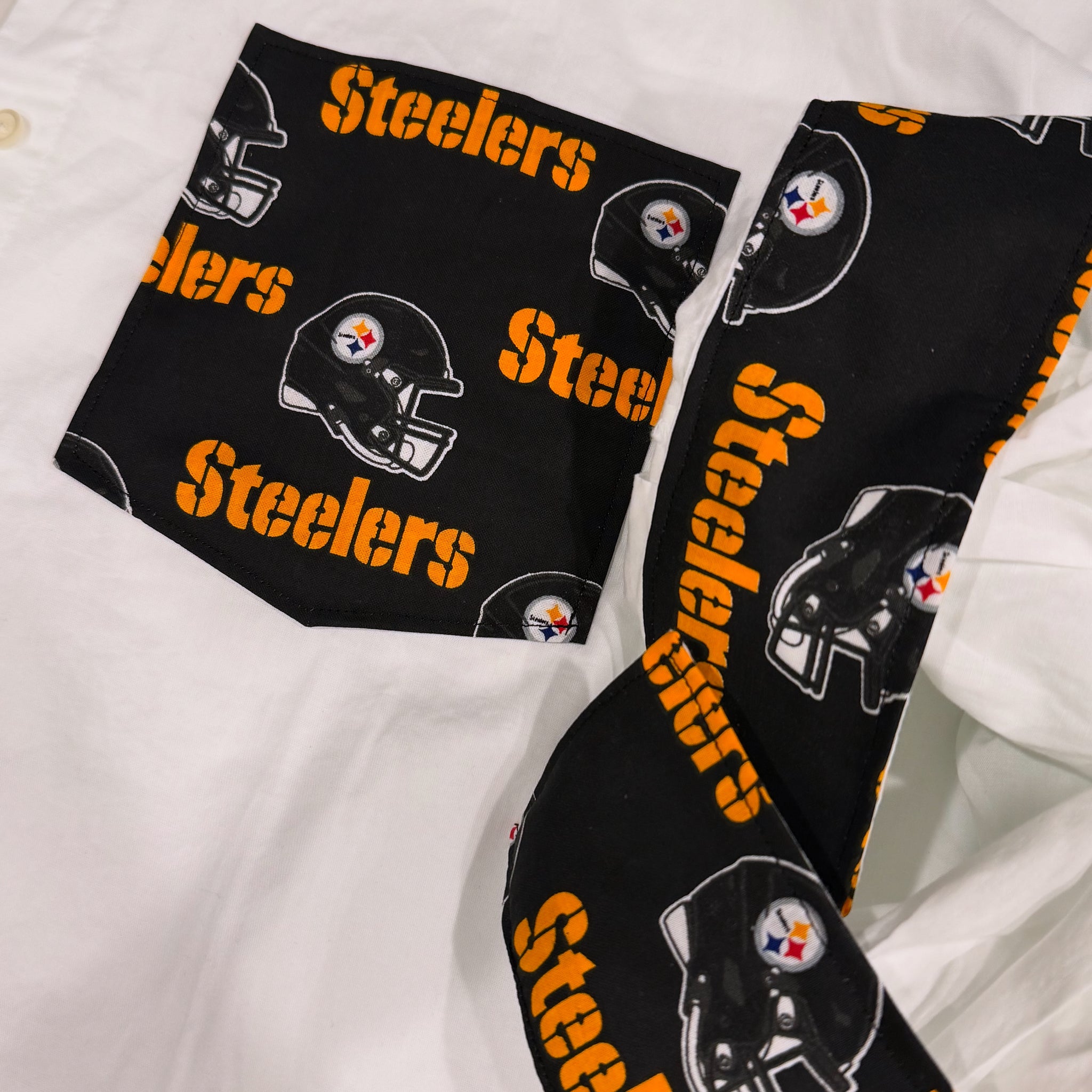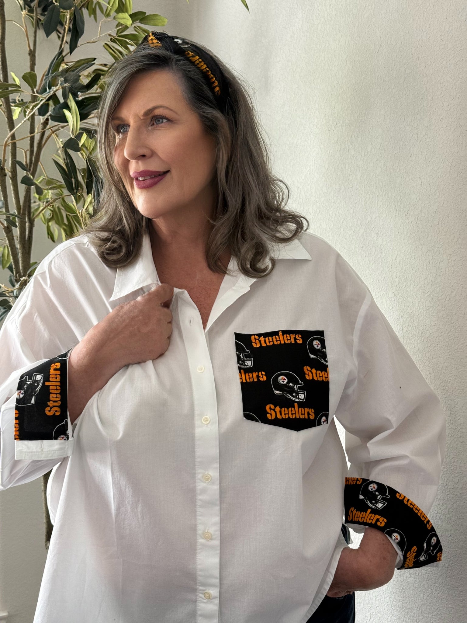 Oversized boyfriend cut button down shirt. Your favorite team fabric on cuffs and pocket. Pocket is sewn shut.