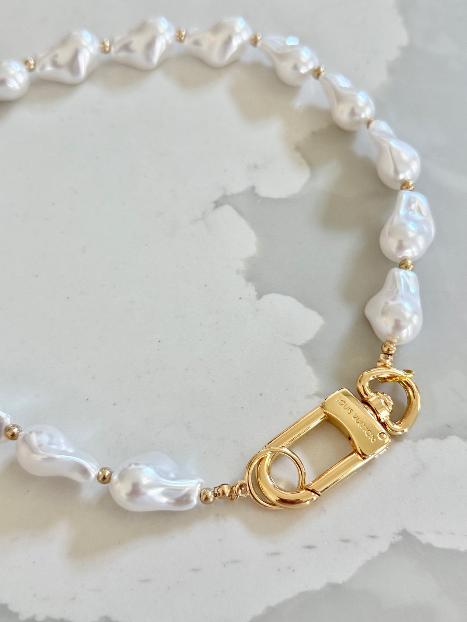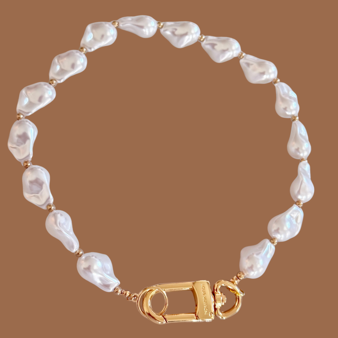 Repurposed bag charm on faux pearl necklace. 17” length.