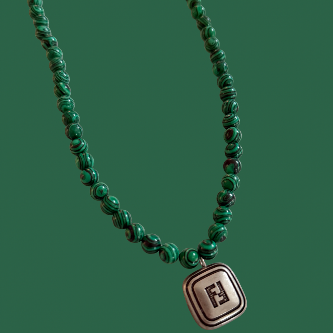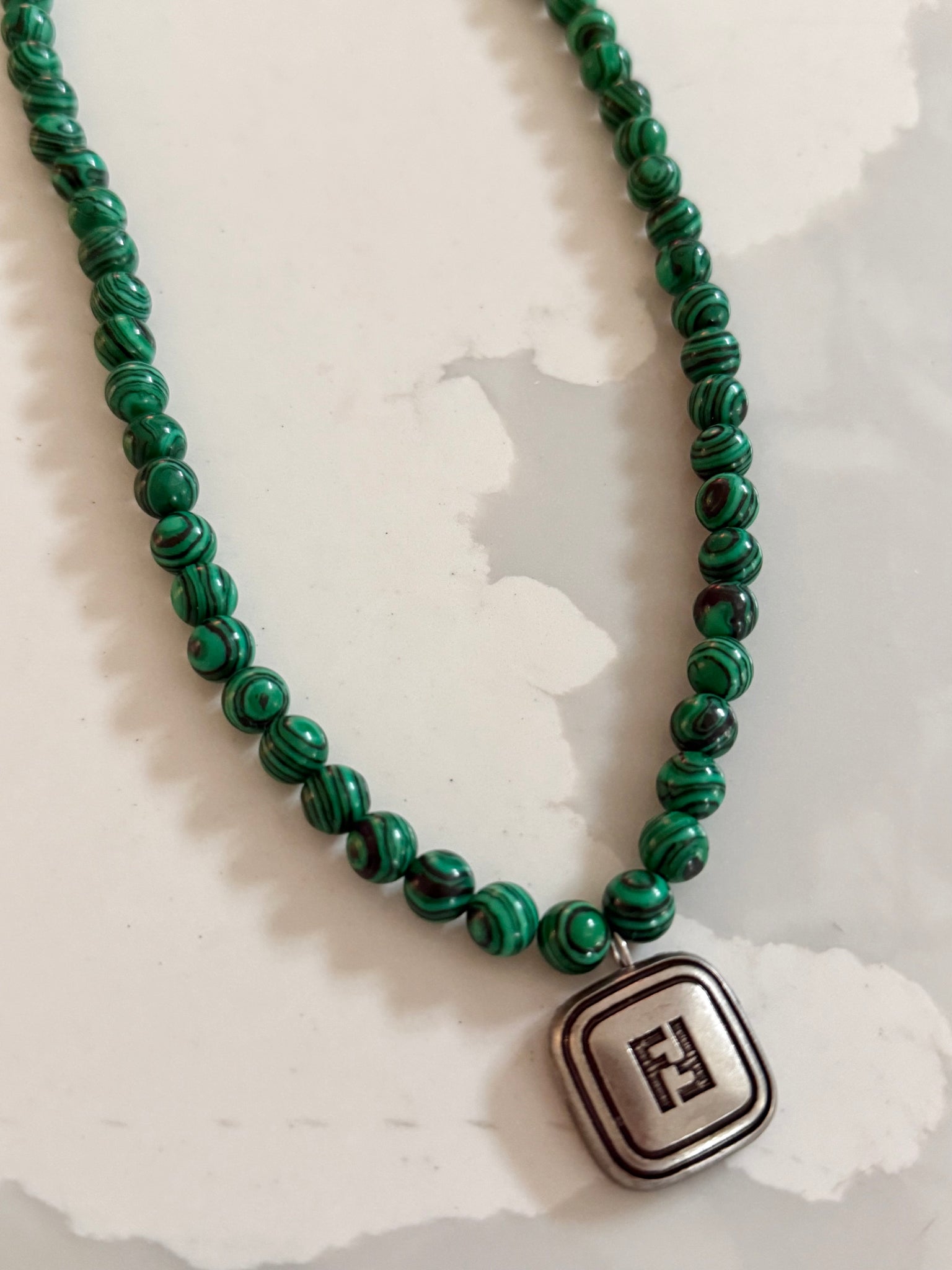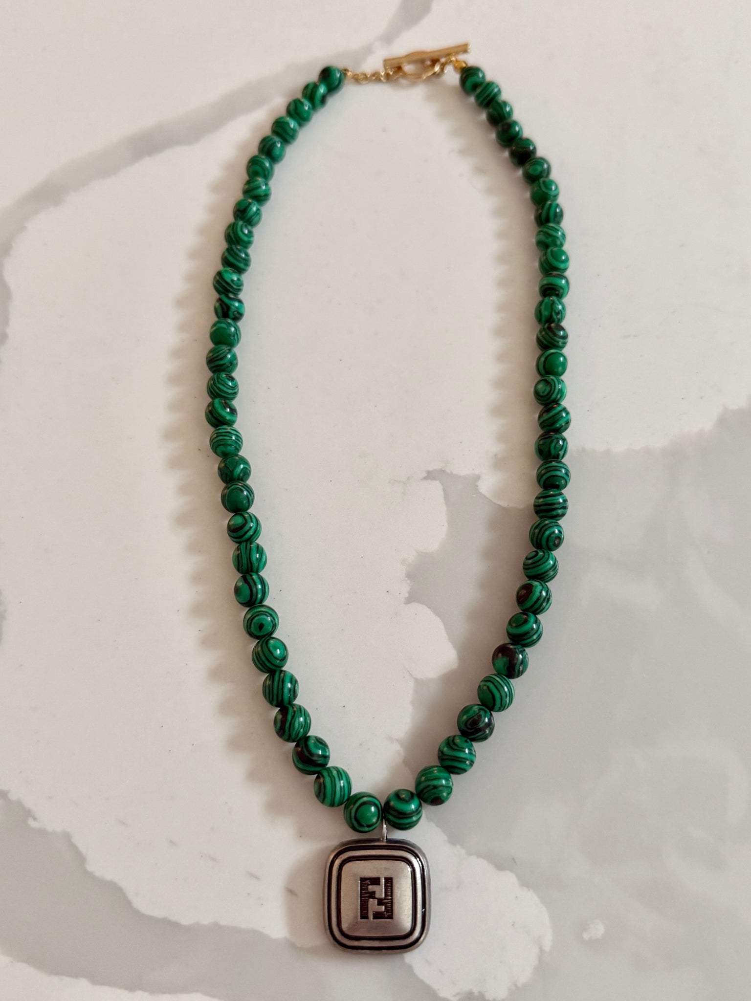 Repurposed bag charm on stone beaded necklace. 16”-18” length.