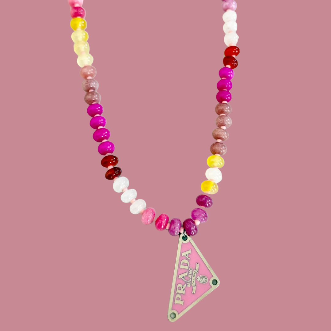 Repurposed bag charm on glass beaded necklace. 16-18” length.