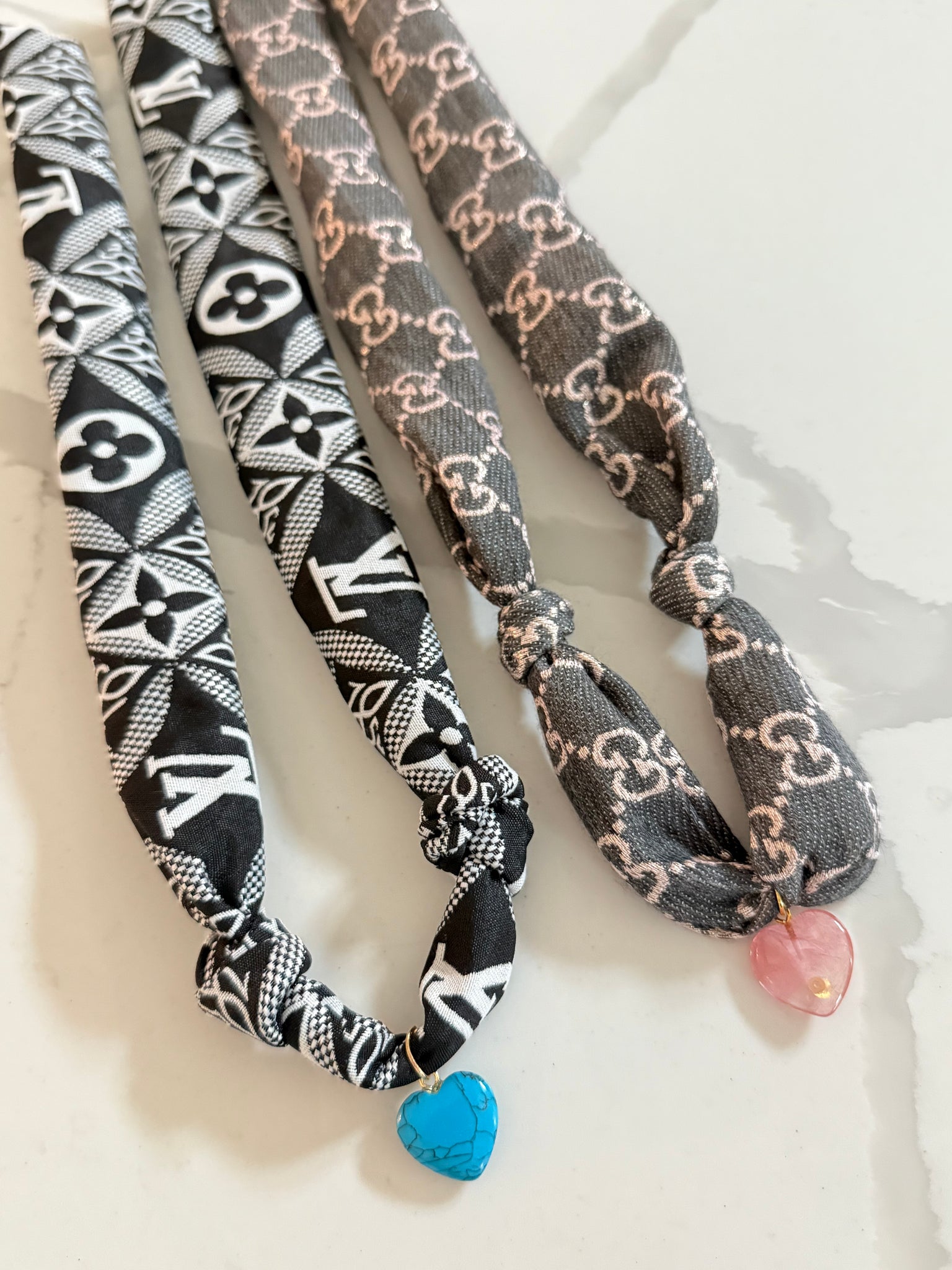Repurposed adjustable scarf necklace with rose quartz heart charm.