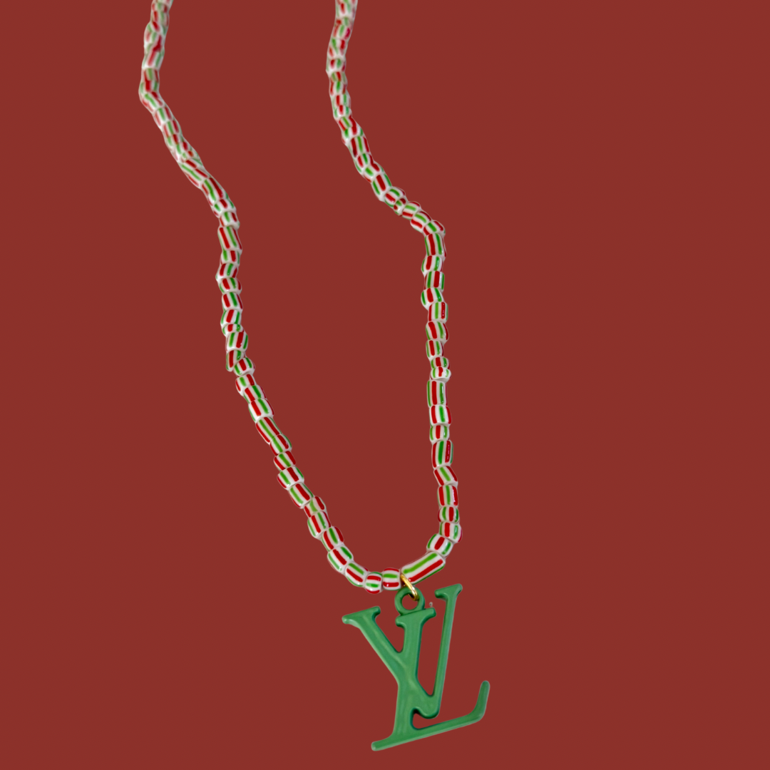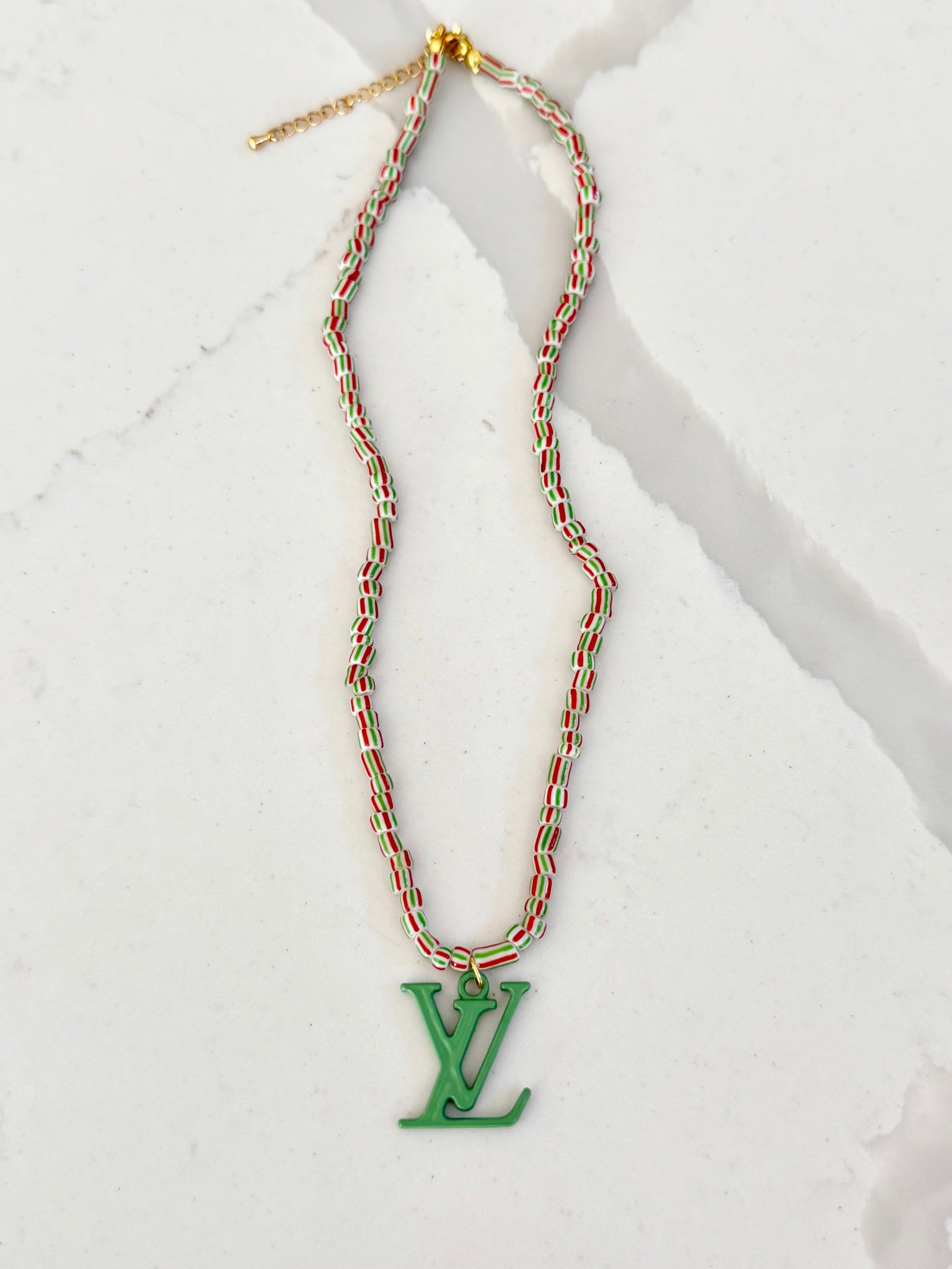Repurposed bag charm on glass beaded necklace. 16”-18” length.